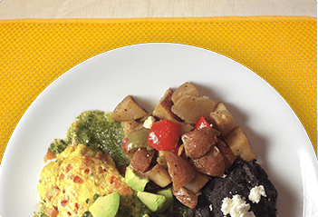 Two scrambled eggs with salsa fresca, cheese, and avocado, topped with salsa tomatillo and queso fresco, served with potatoes, refried beans, and tortillas.