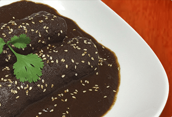 Boneless-skinless chicken, topped with Mole, made with 6 types of dry chile peppers, almonds, walnuts, peanuts, pine-nuts, pecans, raisins, sesame seeds, and chocolate, served with rice beans and homemade tortillas.