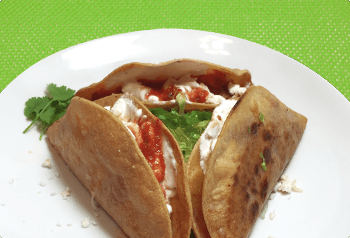 Crisp corn tortilla, filled with chipotle chicken, potatoes, and onions, with sour cream, sansa roja and cheese.